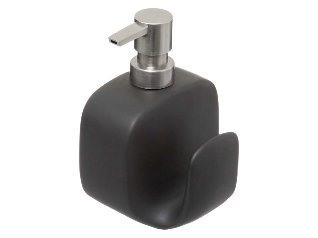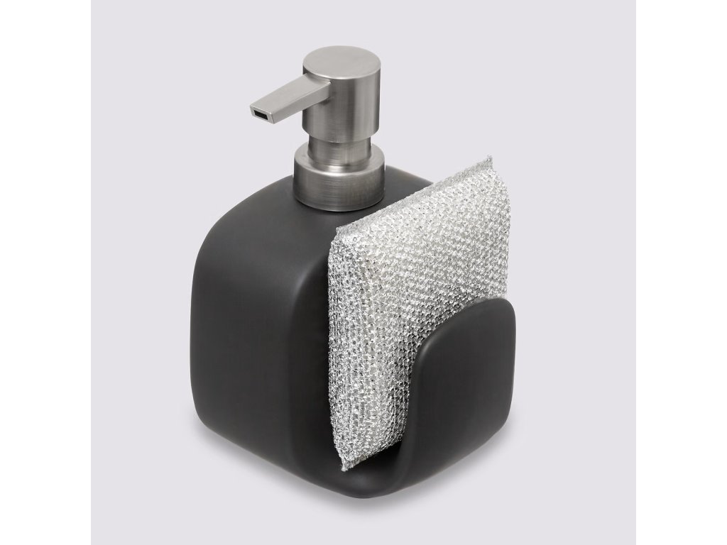 Keramický stylový dávkovač prostředku na mytí nádobí s houbičkou, barva černá, objem 400 ml, rozměry D. 11,5 x H. 9 x V. 15,5 cm.