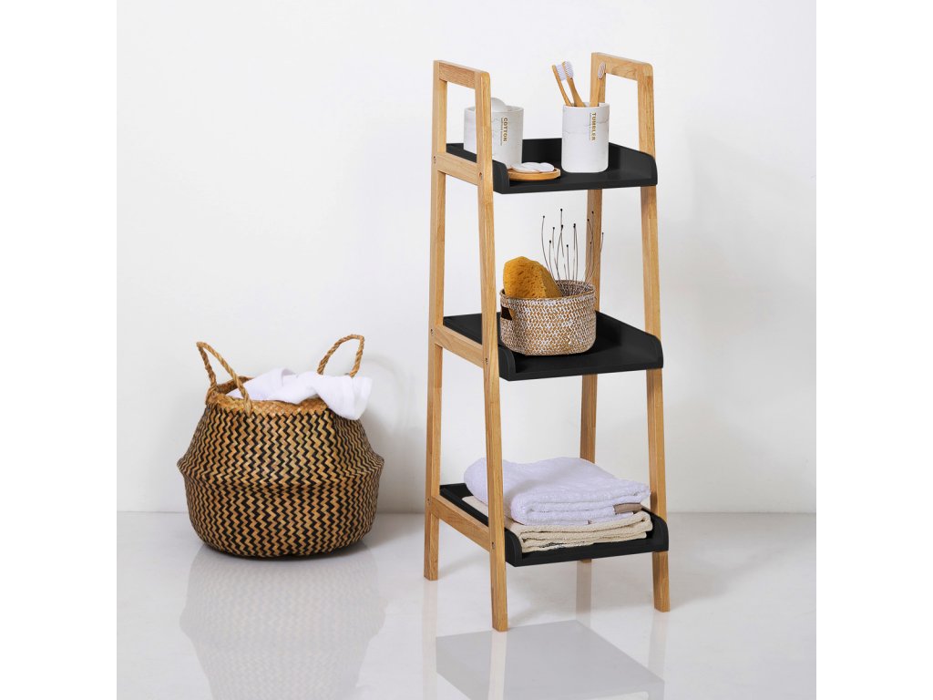 Přírodní Elegance: Zkrášlete svůj domov pomocí našeho 3-policového bambusového regálu, který spojuje přírodní kouzlo s praktičností. Jeho design je ideální pro koupelnu nebo šatnu, a černé police dodávají moderní akcent.