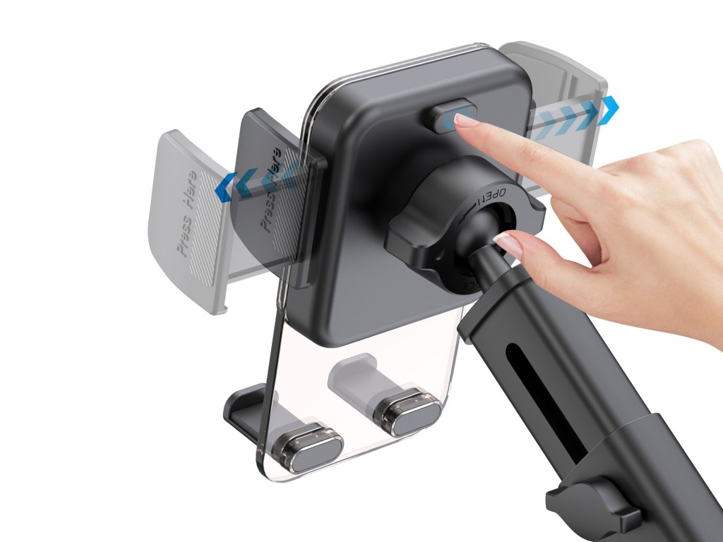 Pohodlné ovládání jednou rukou Držák je vybaven automatickým mechanickým systémem, který umožňuje snadné otevření a zavření jednou rukou. Telefon lze upevnit stisknutím jednoho tlačítka, což zajišťuje rychlou a bezpečnou manipulaci.